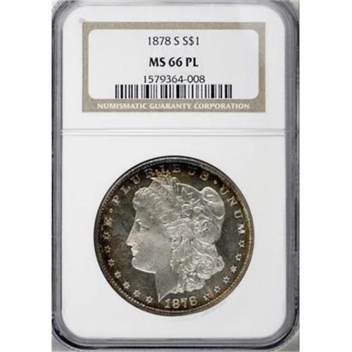 <B>1878-S $1 MS66 Prooflike NGC.</B></I> An outstanding Premium Gem with fully prooflike obverse and reverse fields. The obverse is mostly brilliant with peripheral iridescence, and the reverse is mostly lilac and blue.<BR><BR><B>Coin Engraver:</B> George T. Morgan<BR><BR><b>Shipping:</b> Coins & Currency (<a target="_blank" href="http://www.heritageauctions.com/common/shipping.php">view shipping information</a>)