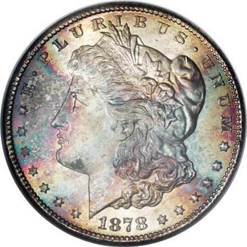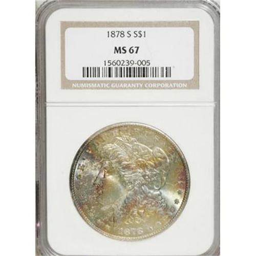 <B>1878-S $1 MS67 NGC.</B></I> This spectacular Superb Gem is tied for the numerically finest certified by NGC (12/07). Both sides show decisively detailed devices and strong luster with just a hint of frost. The obverse offers vibrant, captivating patches of lemon-gold, mint, orange, and violet-rose patina, while the reverse has just a touch of orange at the margins around an aqua-inflected center. A great example of this first-year issue.<BR><BR><B>Coin Engraver:</B> George T. Morgan<BR><BR><b>Shipping:</b> Coins & Currency (<a target="_blank" href="http://www.heritageauctions.com/common/shipping.php">view shipping information</a>)