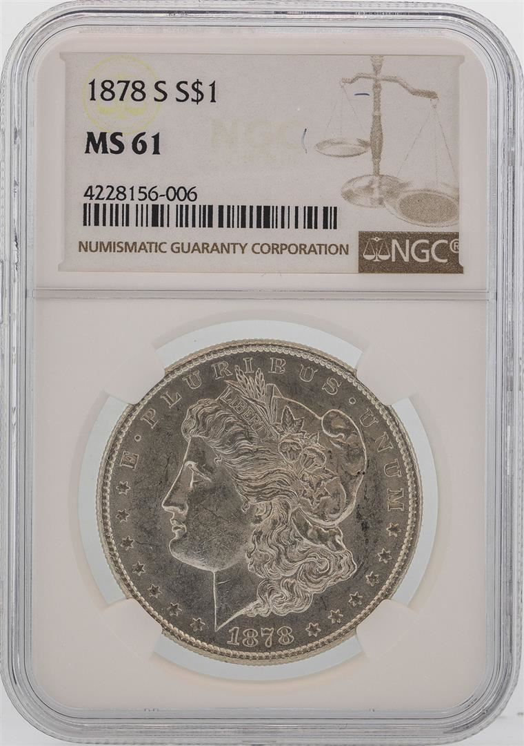 One 1878-S $1 Morgan Silver Dollar Coin NGC MS61. NGC Certified.