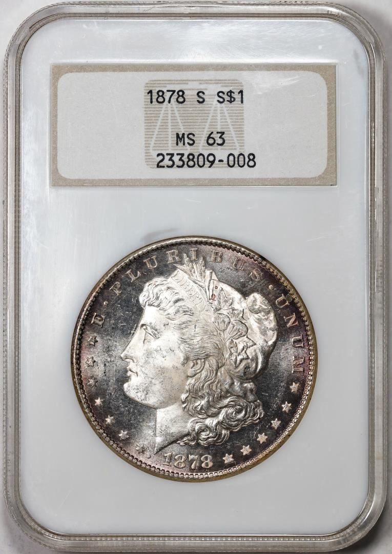 One 1878-S $1 Morgan Silver Dollar Coin NGC MS63 Old Fatty Holder Nice Toning. NGC Certified.