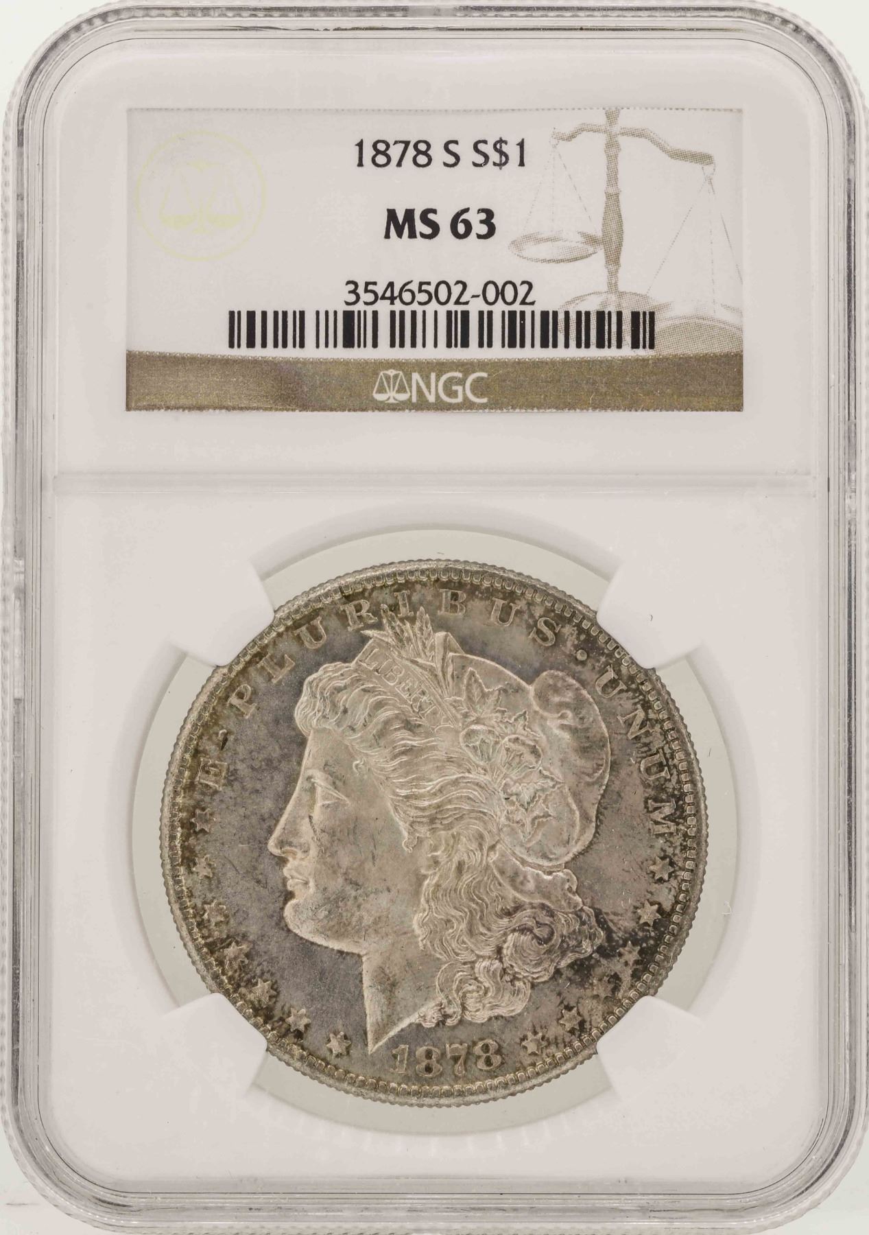 One 1878-S $1 Morgan Silver Dollar Coin NGC MS63.