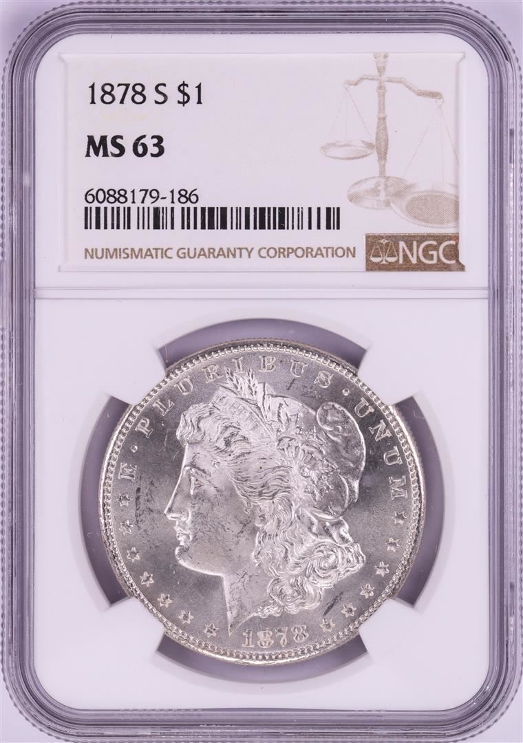 One 1878-S $1 Morgan Silver Dollar Coin NGC MS63. NGC Certified.