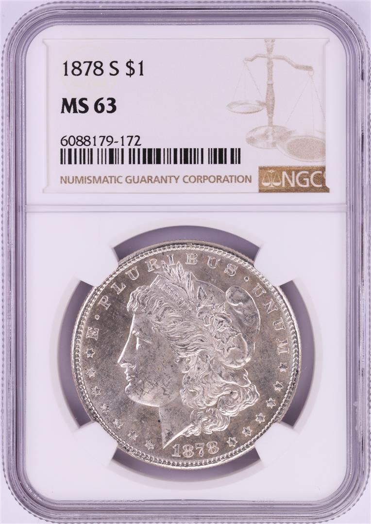 One 1878-S $1 Morgan Silver Dollar Coin NGC MS63. NGC Certified.