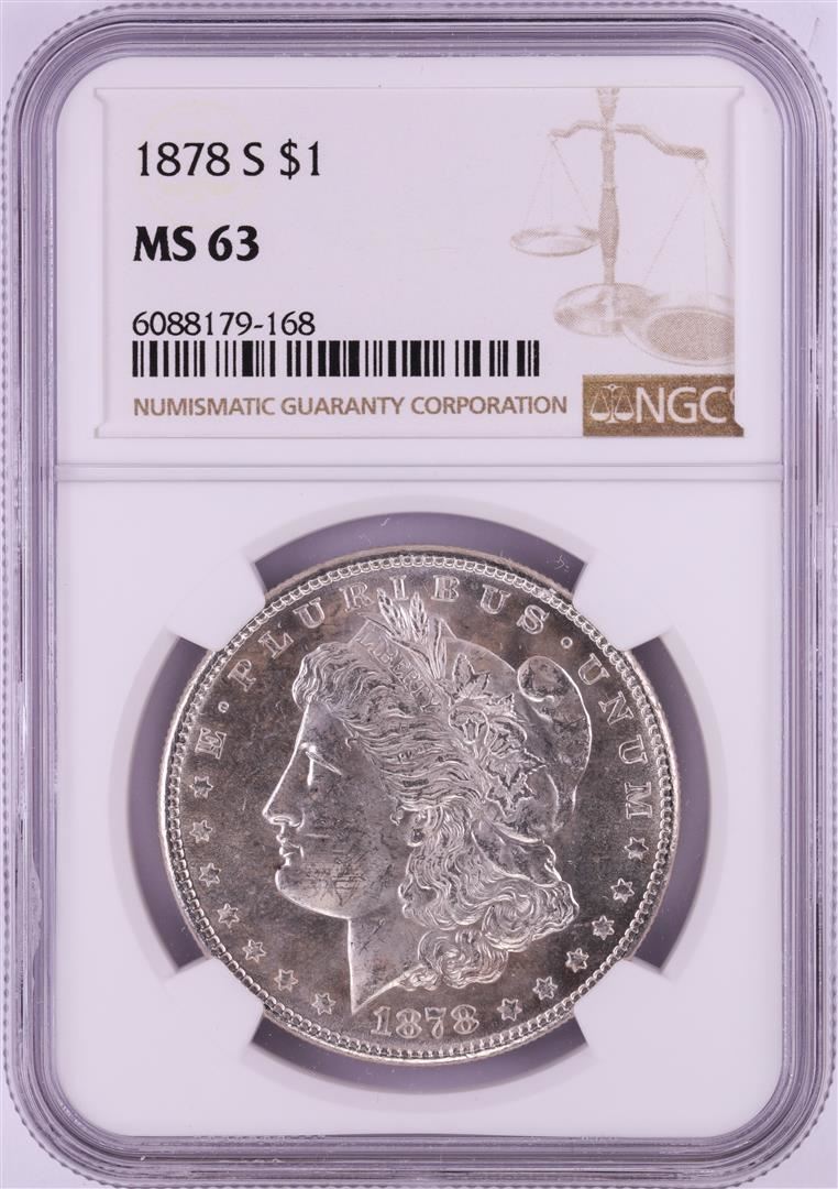 One 1878-S $1 Morgan Silver Dollar Coin NGC MS63. NGC Certified.