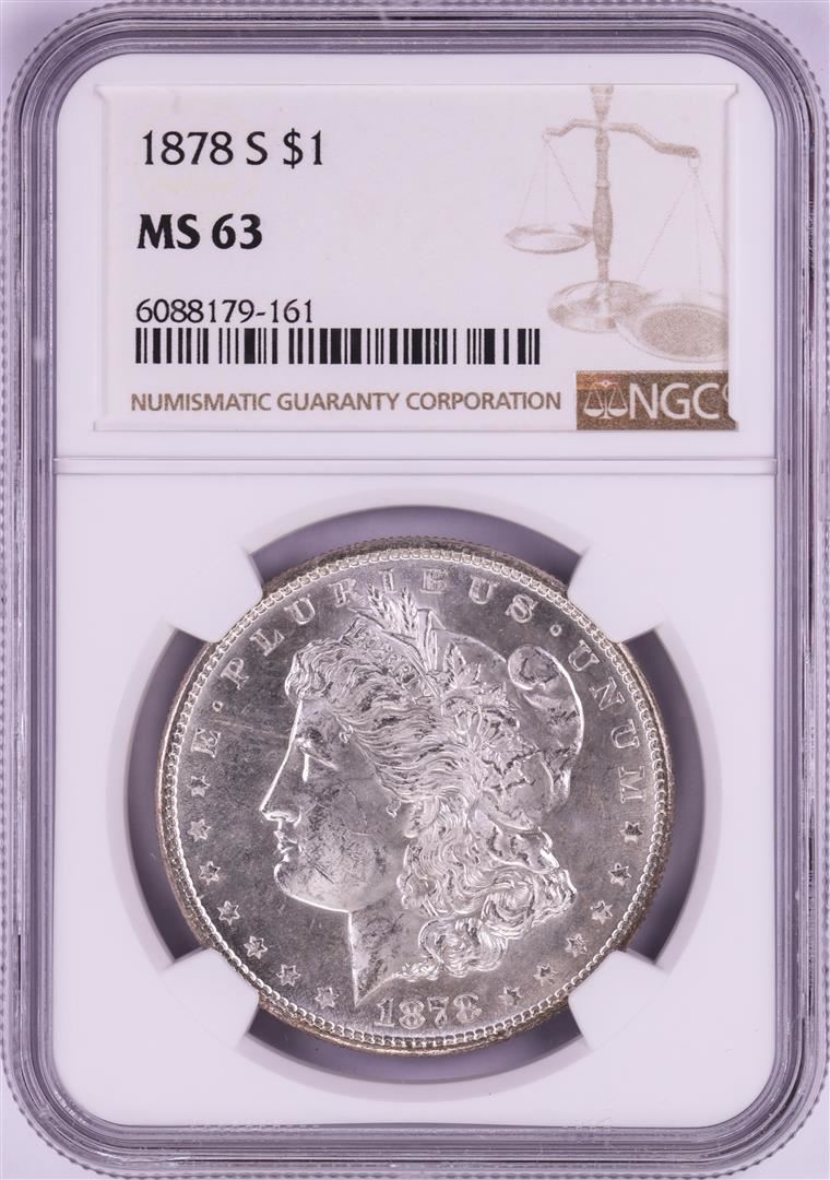 One 1878-S $1 Morgan Silver Dollar Coin NGC MS63. NGC Certified.