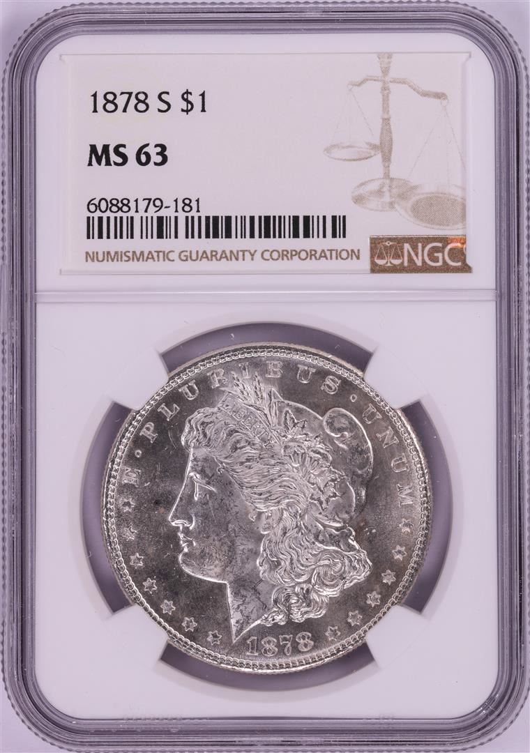 One 1878-S $1 Morgan Silver Dollar Coin NGC MS63. NGC Certified.