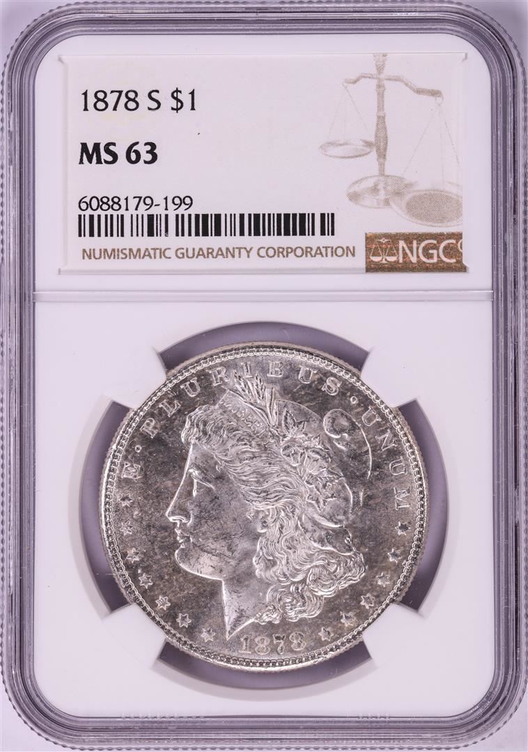 One 1878-S $1 Morgan Silver Dollar Coin NGC MS63. NGC Certified.