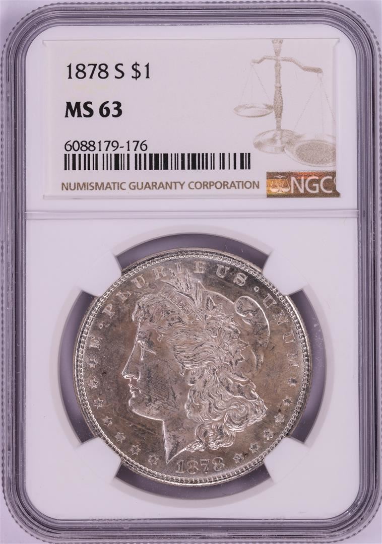 One 1878-S $1 Morgan Silver Dollar Coin NGC MS63. NGC Certified.