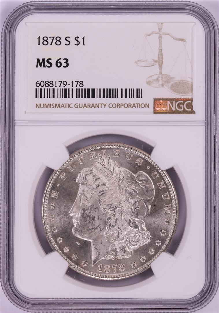 One 1878-S $1 Morgan Silver Dollar Coin NGC MS63. NGC Certified.