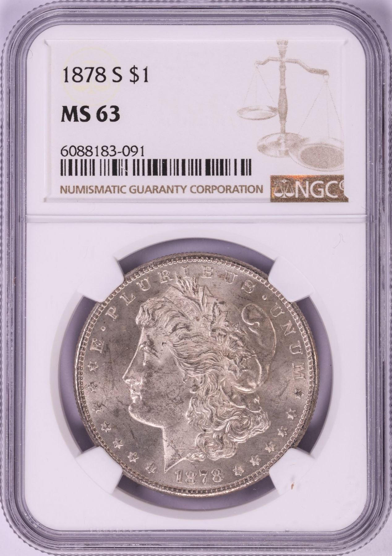 One 1878-S $1 Morgan Silver Dollar Coin NGC MS63.