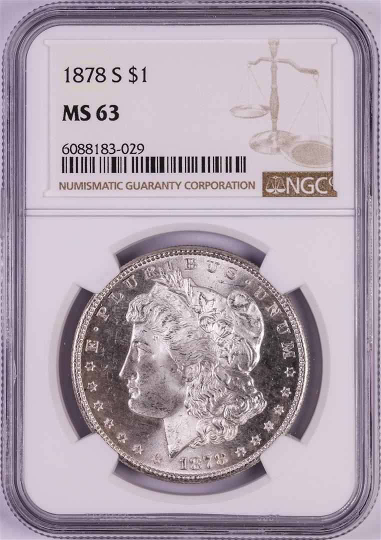 One 1878-S $1 Morgan Silver Dollar Coin NGC MS63. NGC Certified.