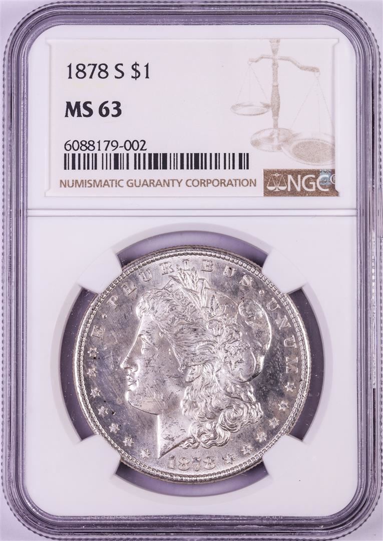 One 1878-S $1 Morgan Silver Dollar Coin NGC MS63.