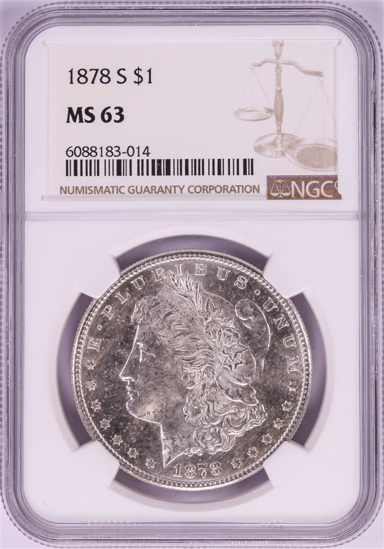One 1878-S $1 Morgan Silver Dollar Coin NGC MS63. NGC Certified.
