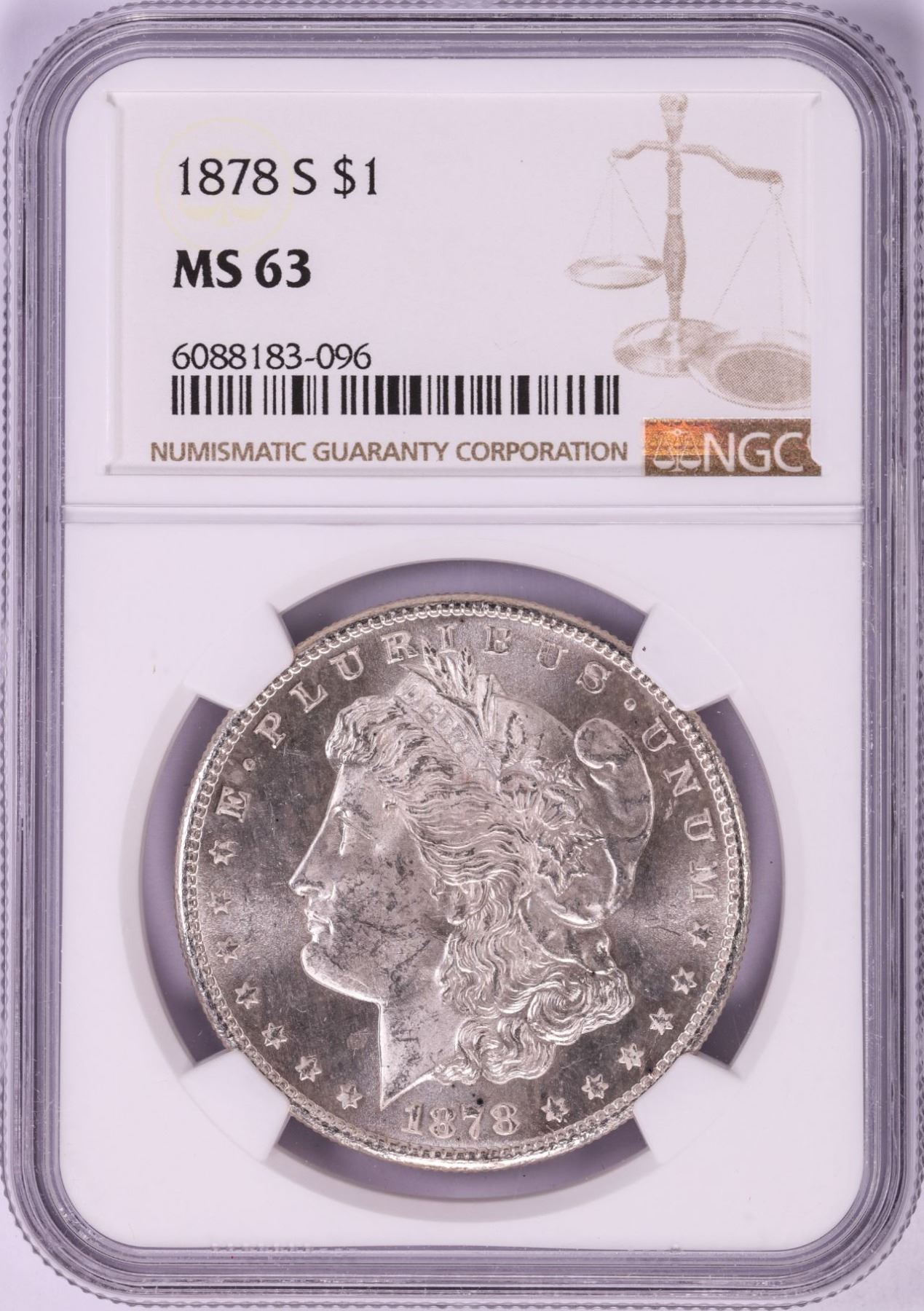 One 1878-S $1 Morgan Silver Dollar Coin NGC MS63.