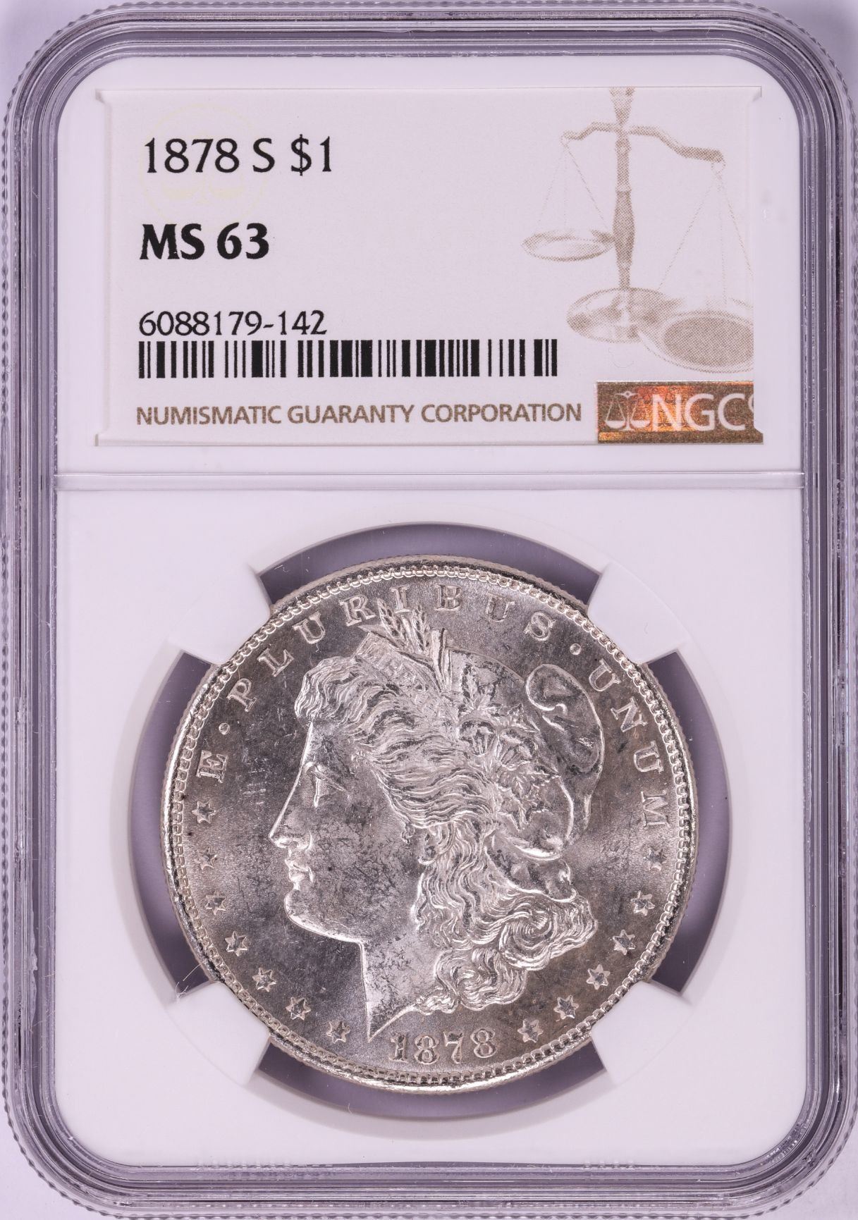 One 1878-S $1 Morgan Silver Dollar Coin NGC MS63.