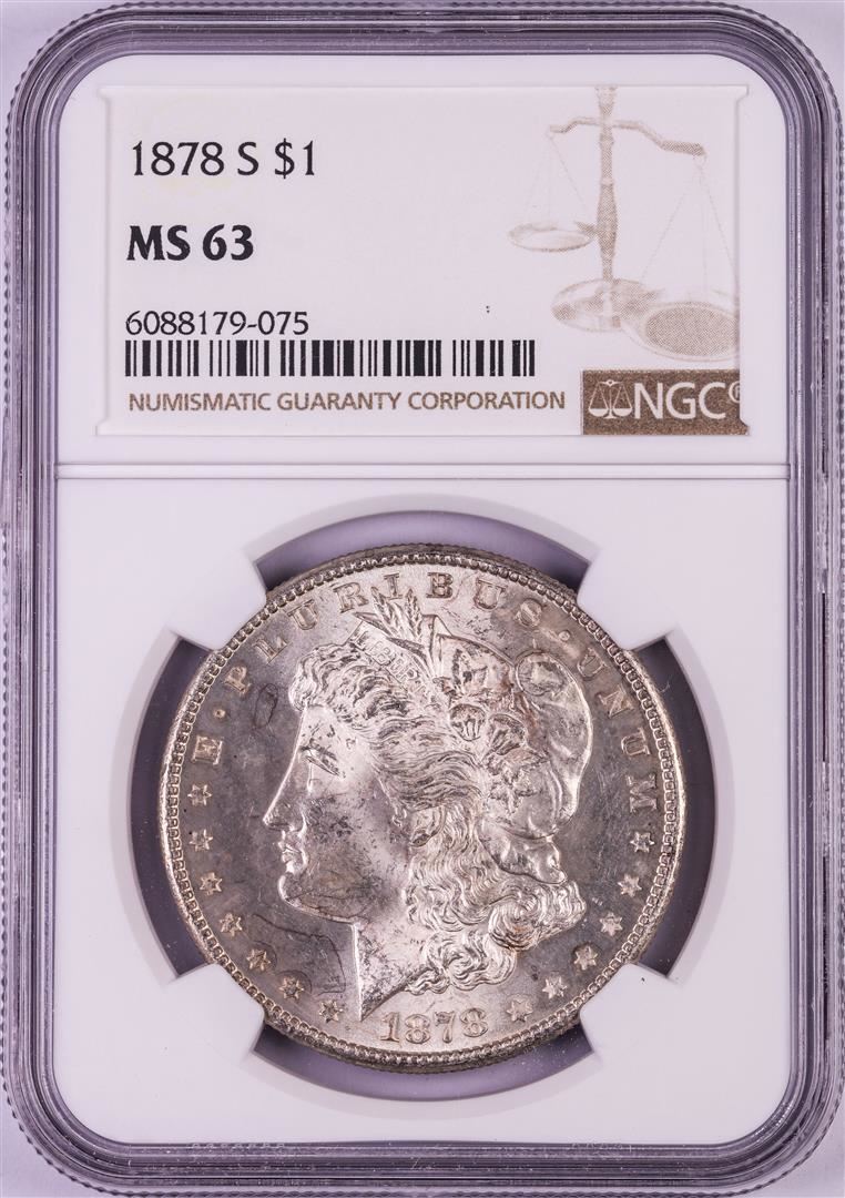 One 1878-S $1 Morgan Silver Dollar Coin NGC MS63. NGC Certified.
