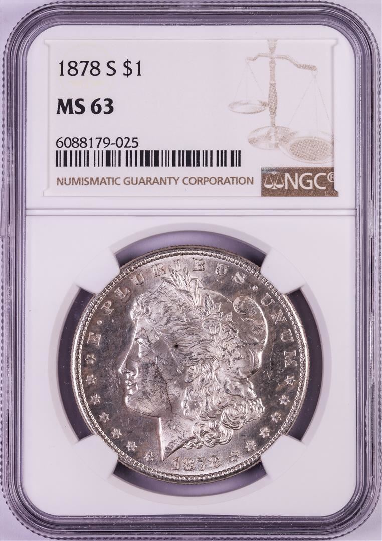 One 1878-S $1 Morgan Silver Dollar Coin NGC MS63.