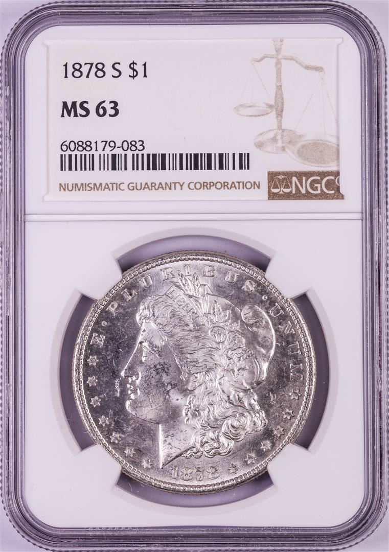 One 1878-S $1 Morgan Silver Dollar Coin NGC MS63. NGC Certified.