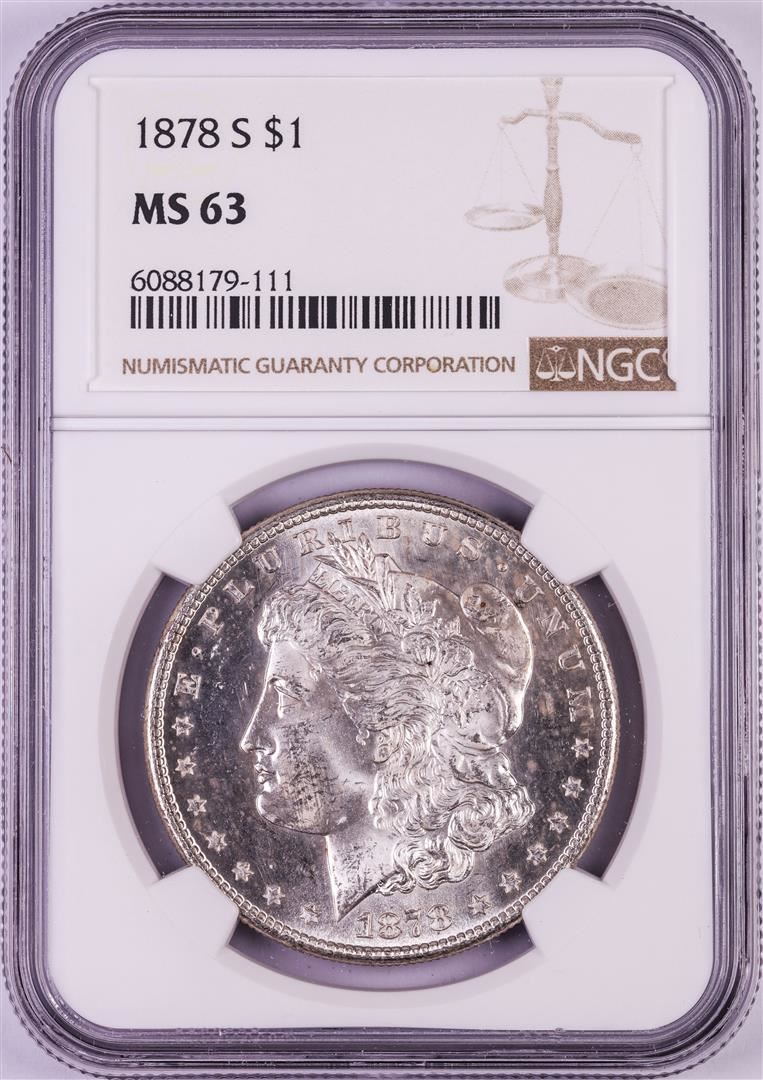 One 1878-S $1 Morgan Silver Dollar Coin NGC MS63. NGC Certified.