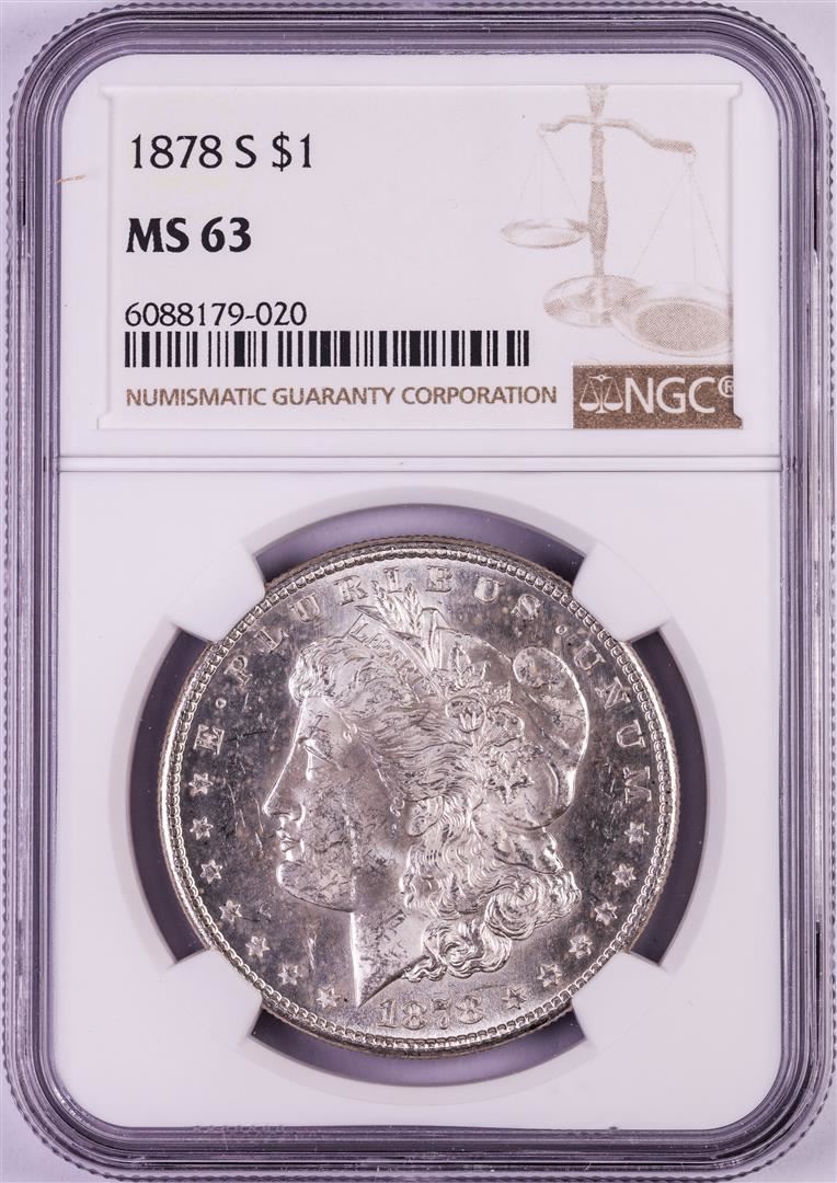 One 1878-S $1 Morgan Silver Dollar Coin NGC MS63.