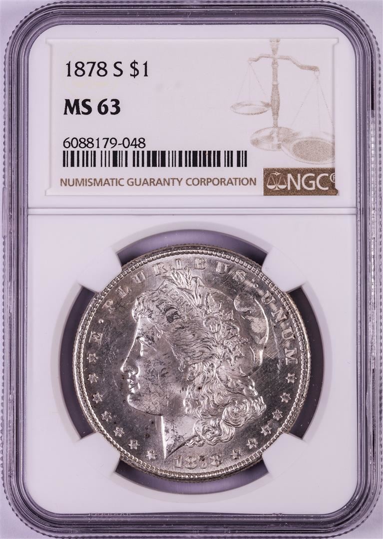 One 1878-S $1 Morgan Silver Dollar Coin NGC MS63. NGC Certified.
