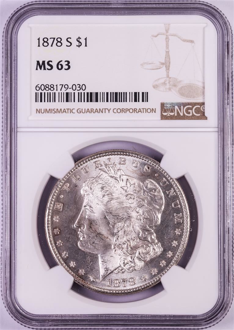 One 1878-S $1 Morgan Silver Dollar Coin NGC MS63.