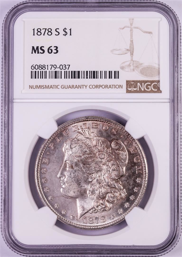 One 1878-S $1 Morgan Silver Dollar Coin NGC MS63. NGC Certified.