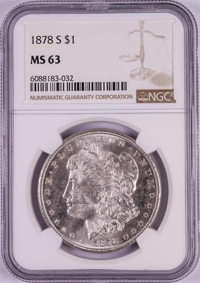 One 1878-S $1 Morgan Silver Dollar Coin NGC MS63. NGC Certified.