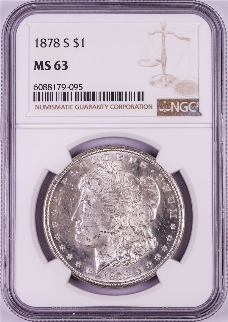 One 1878-S $1 Morgan Silver Dollar Coin NGC MS63. NGC Certified.
