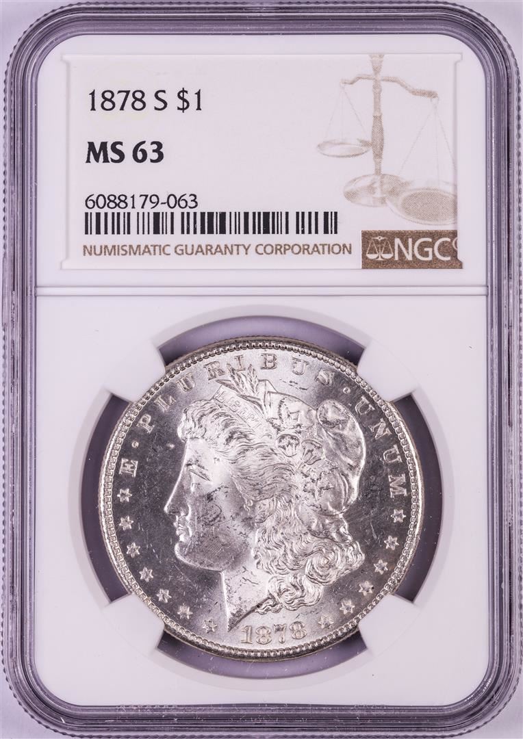 One 1878-S $1 Morgan Silver Dollar Coin NGC MS63. NGC Certified.