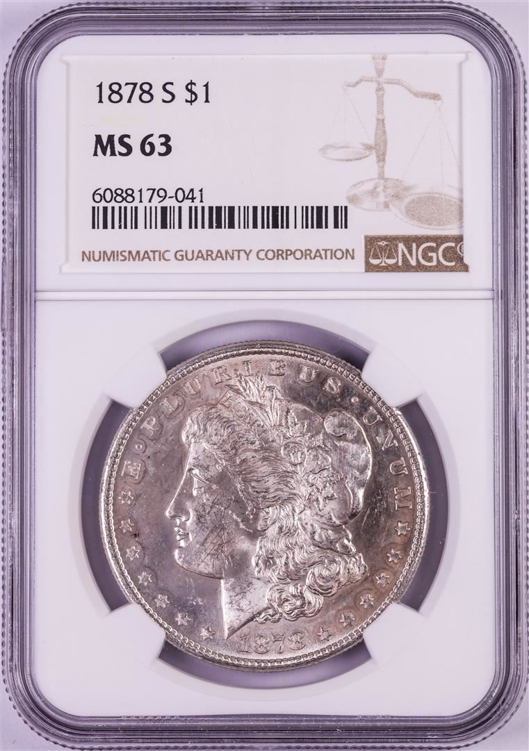One 1878-S $1 Morgan Silver Dollar Coin NGC MS63. NGC Certified.