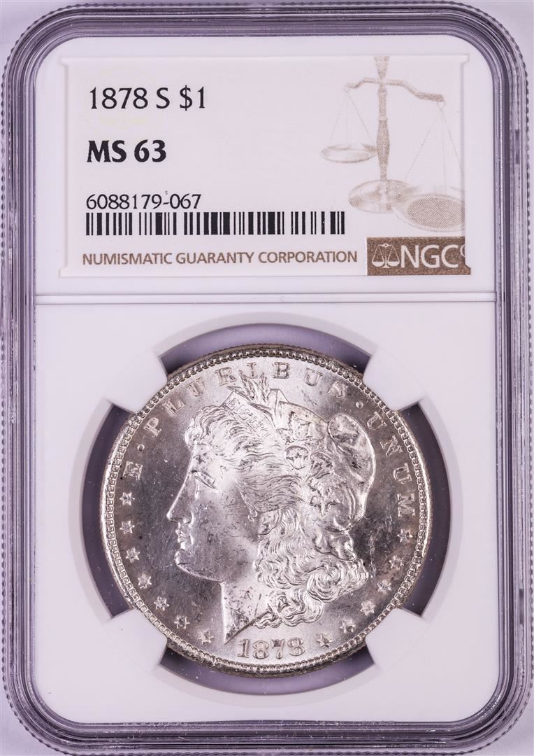 One 1878-S $1 Morgan Silver Dollar Coin NGC MS63. NGC Certified.