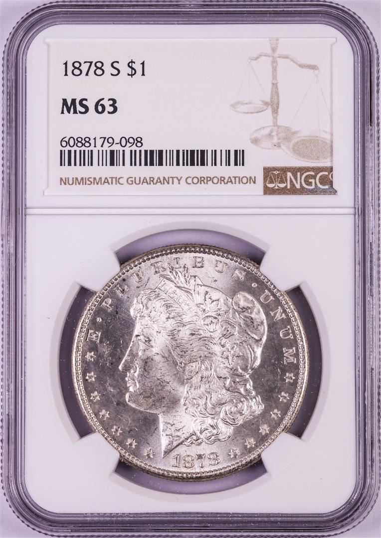 One 1878-S $1 Morgan Silver Dollar Coin NGC MS63. NGC Certified.