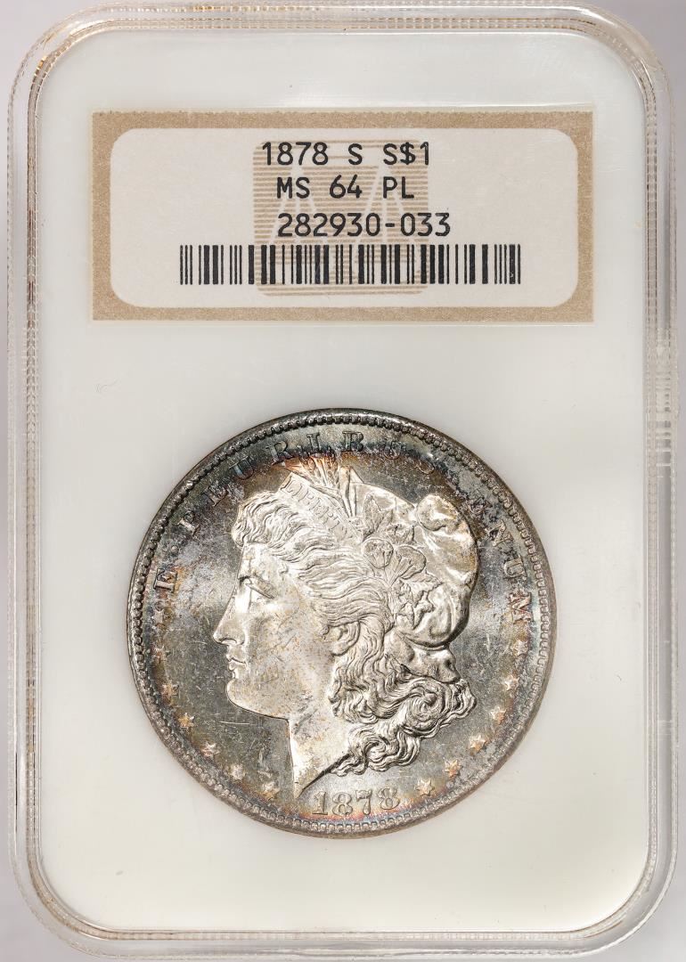 One 1878-S $1 Morgan Silver Dollar Coin NGC MS64PL Old Fatty Holder Nice Toning. NGC Certified.