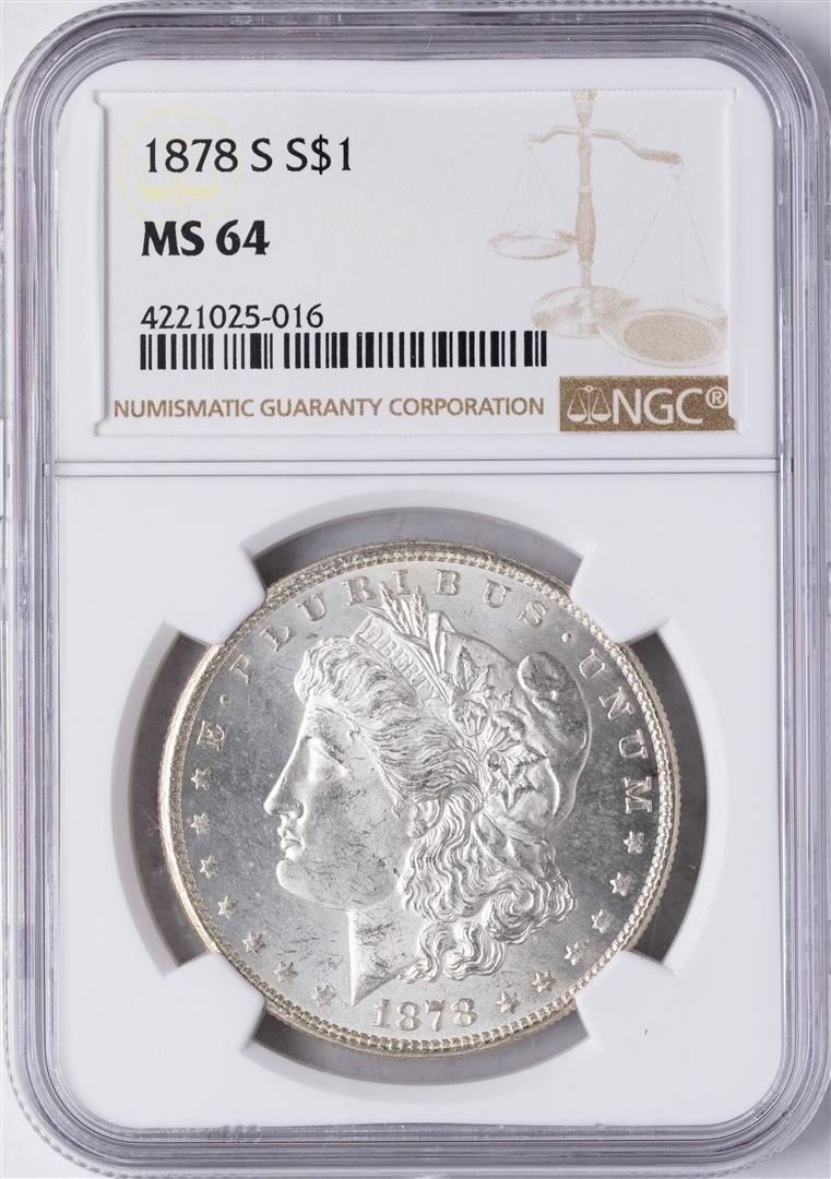 One 1878-S $1 Morgan Silver Dollar Coin NGC MS64. NGC Certified.