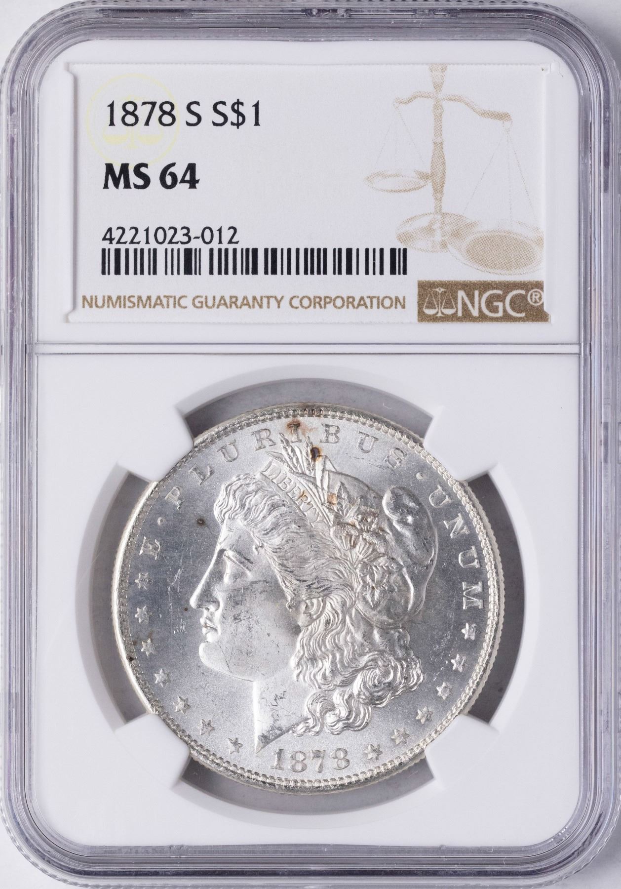 One 1878-S $1 Morgan Silver Dollar Coin NGC MS64.