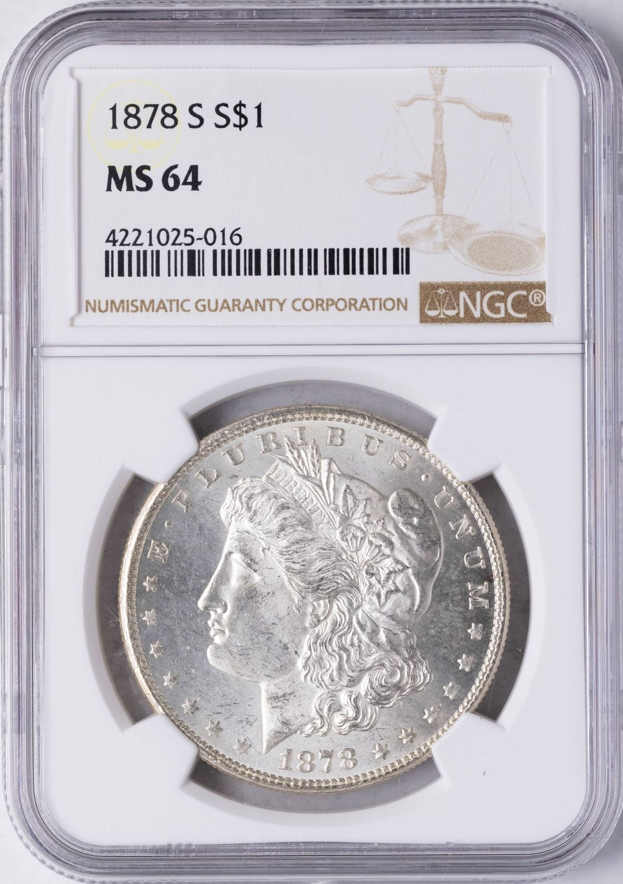 One 1878-S $1 Morgan Silver Dollar Coin NGC MS64.