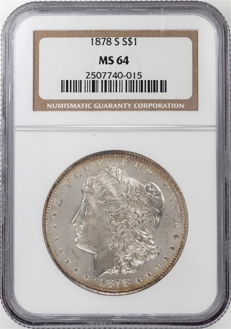 One 1878-S $1 Morgan Silver Dollar Coin NGC MS64. NGC Certified.
