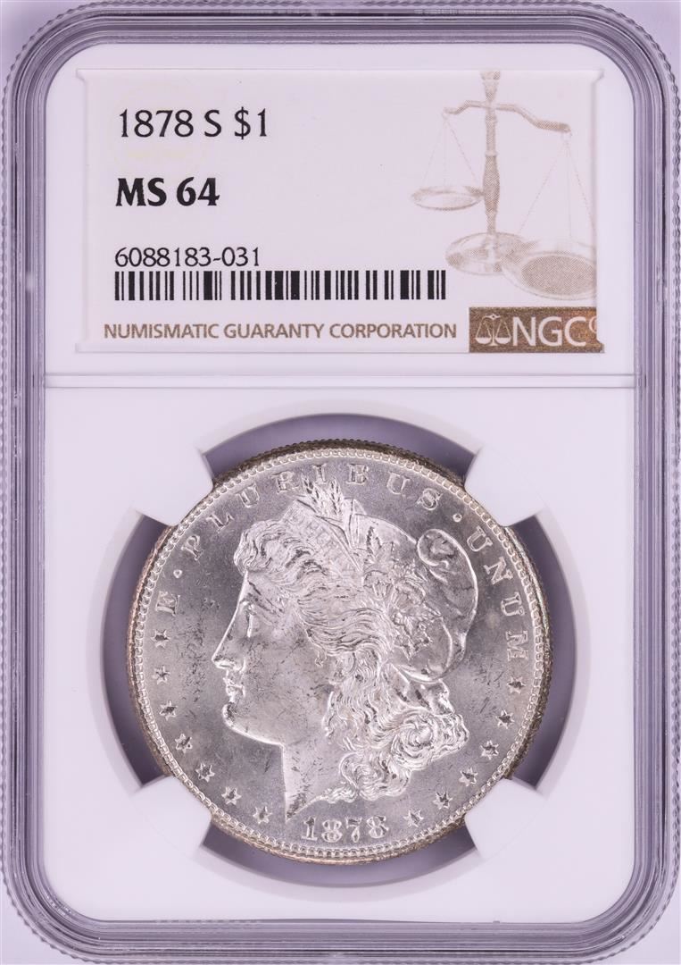 One 1878-S $1 Morgan Silver Dollar Coin NGC MS64. NGC Certified.