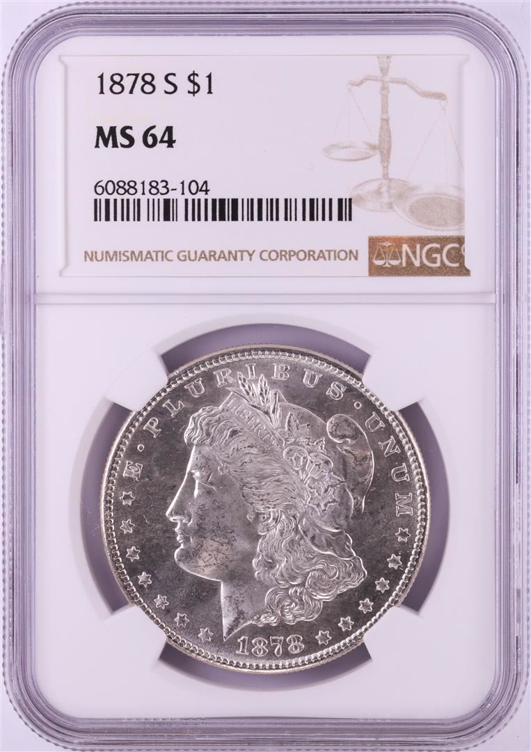 One 1878-S $1 Morgan Silver Dollar Coin NGC MS64. NGC Certified.