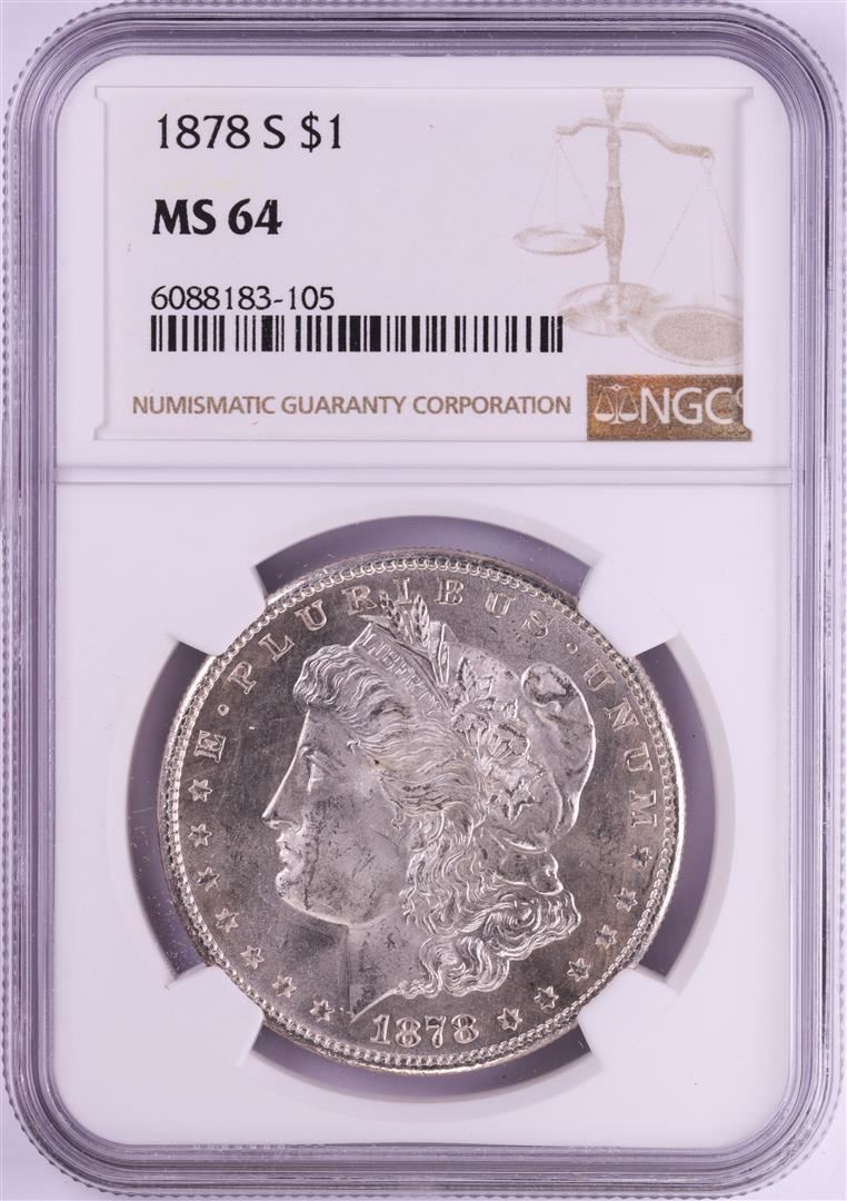 One 1878-S $1 Morgan Silver Dollar Coin NGC MS64. NGC Certified.