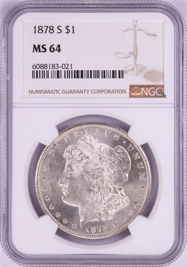 One 1878-S $1 Morgan Silver Dollar Coin NGC MS64. NGC Certified.