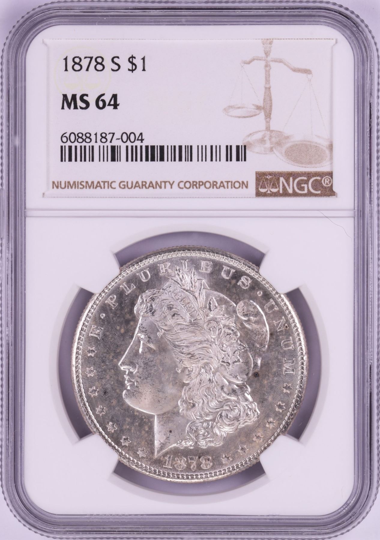 One 1878-S $1 Morgan Silver Dollar Coin NGC MS64.