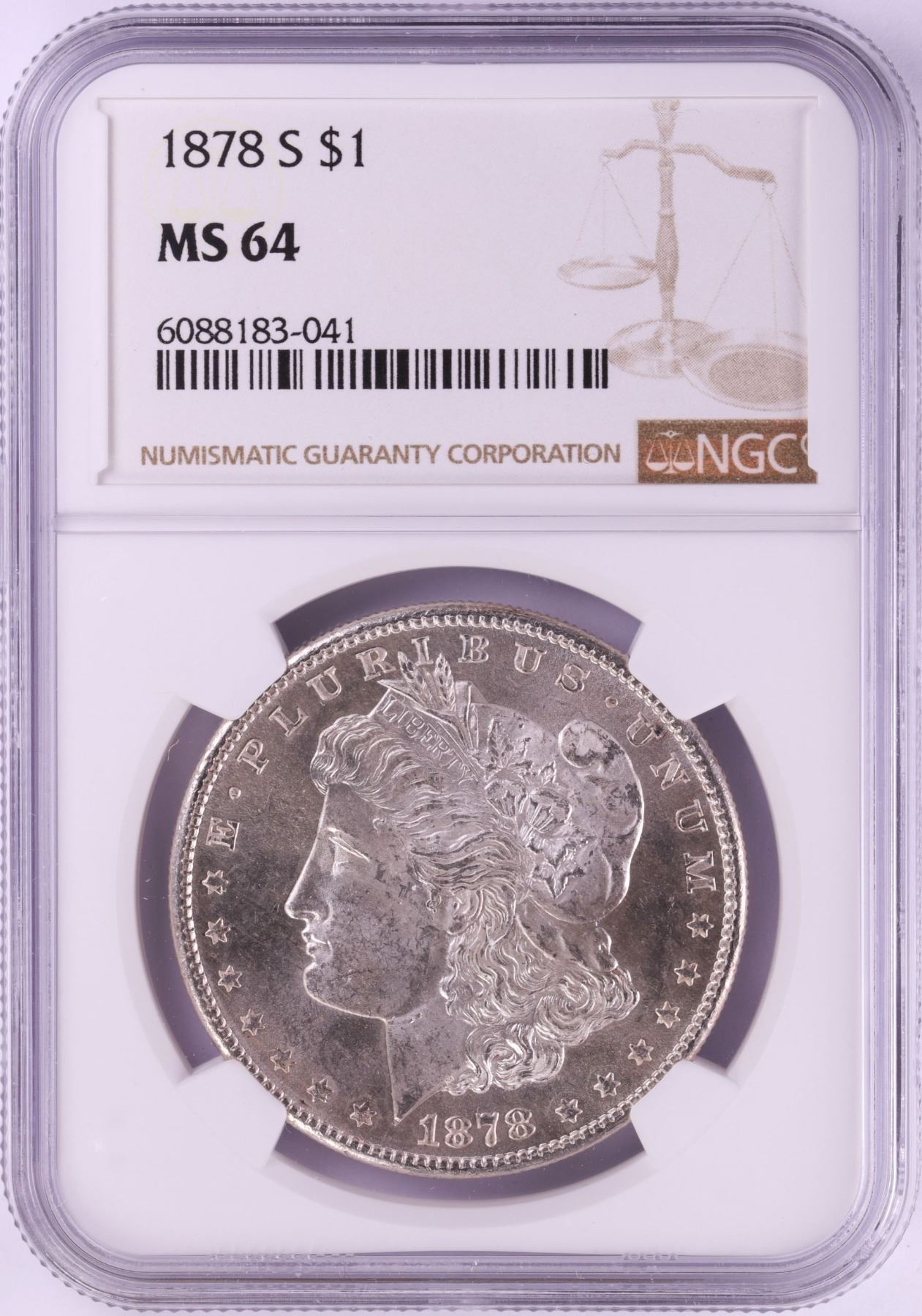 One 1878-S $1 Morgan Silver Dollar Coin NGC MS64.