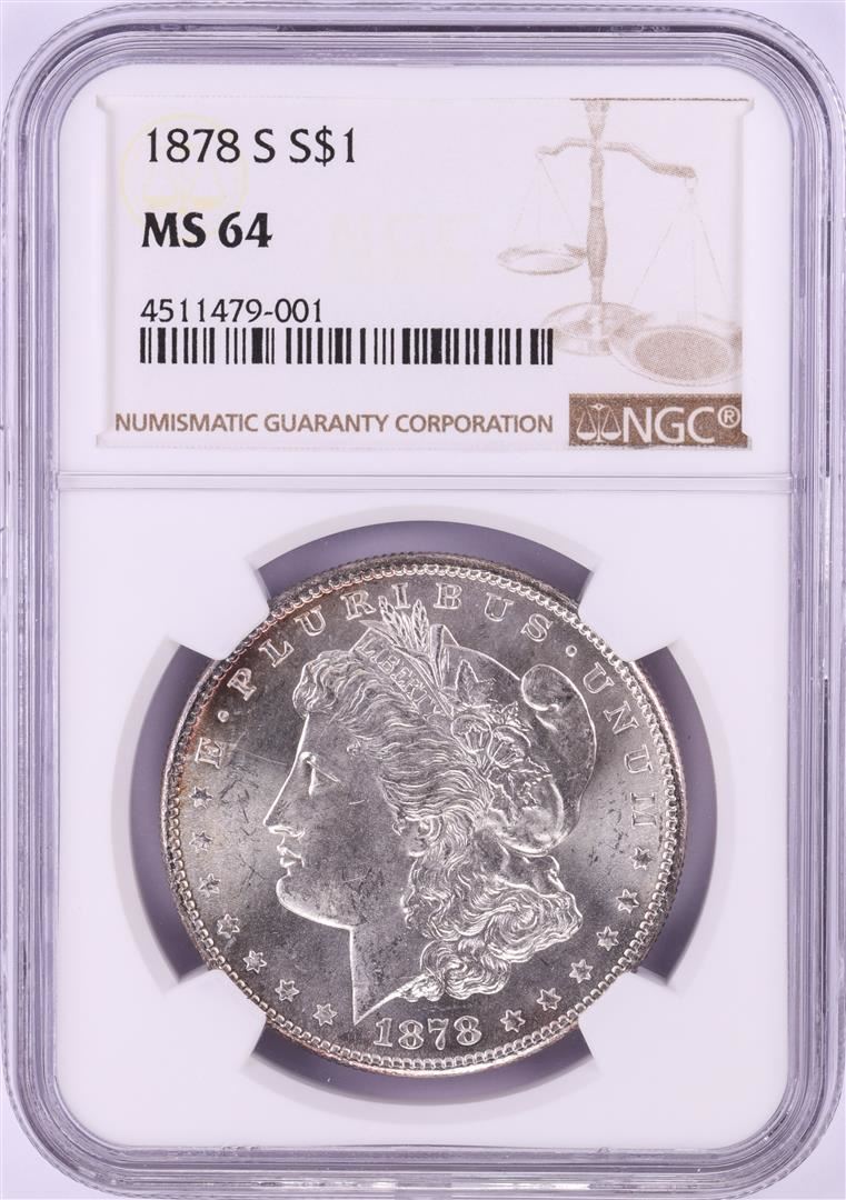 One 1878-S $1 Morgan Silver Dollar Coin NGC MS64. NGC Certified.