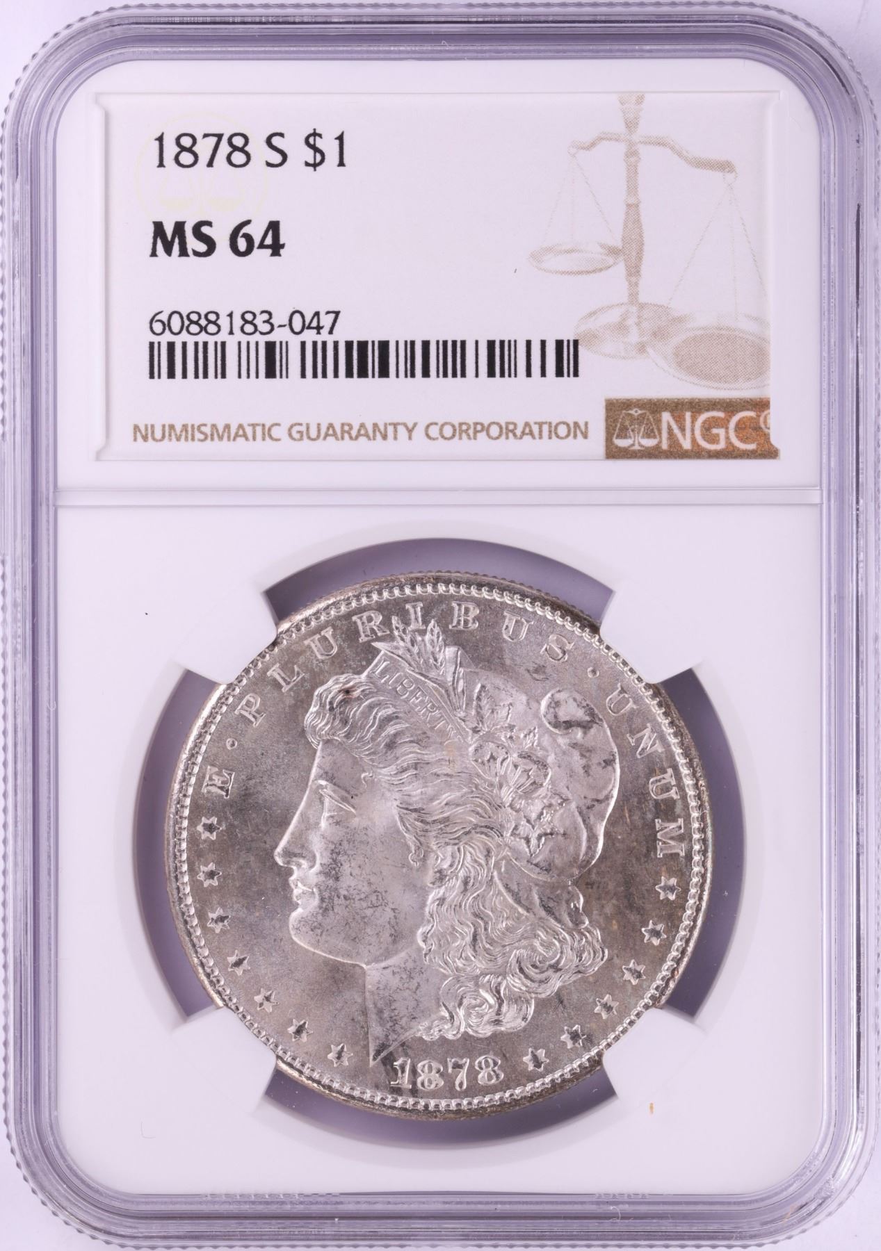 One 1878-S $1 Morgan Silver Dollar Coin NGC MS64.