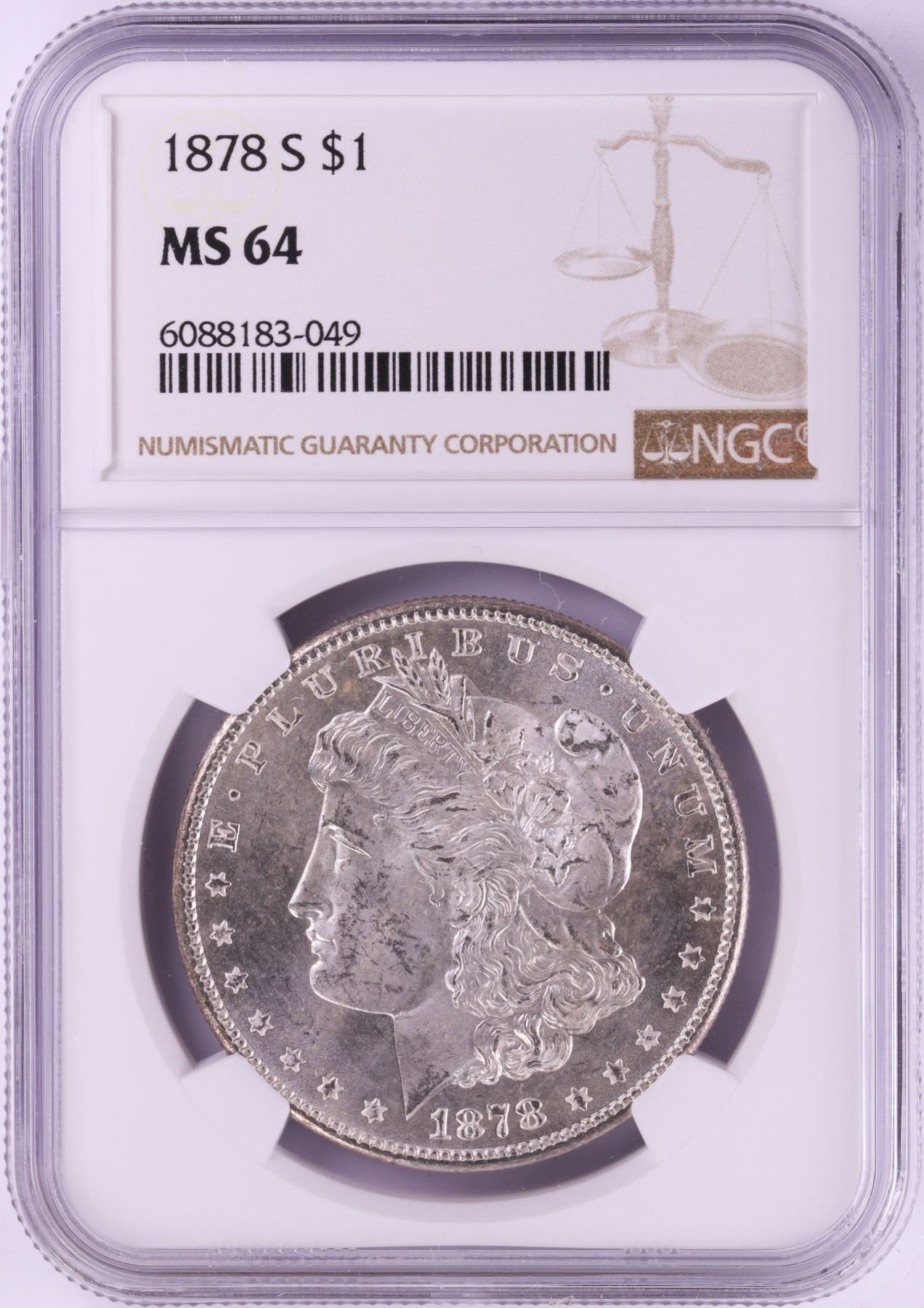 One 1878-S $1 Morgan Silver Dollar Coin NGC MS64.