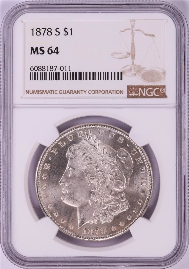 One 1878-S $1 Morgan Silver Dollar Coin NGC MS64. NGC Certified.