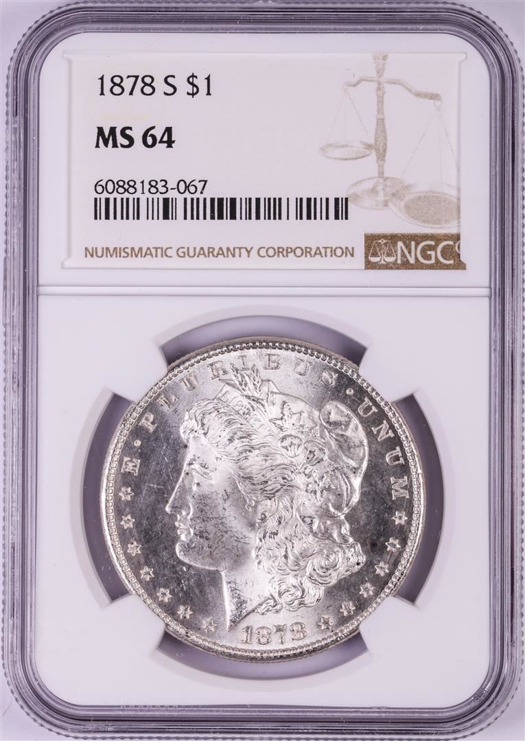 One 1878-S $1 Morgan Silver Dollar Coin NGC MS64. NGC Certified.