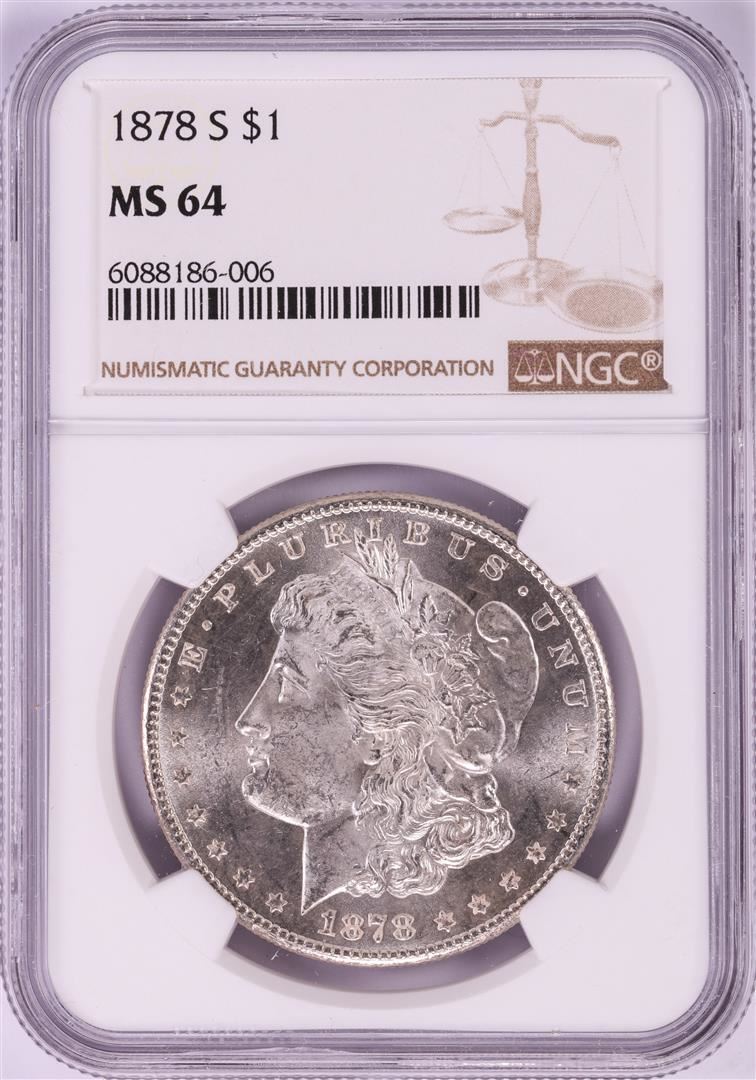One 1878-S $1 Morgan Silver Dollar Coin NGC MS64. NGC Certified.